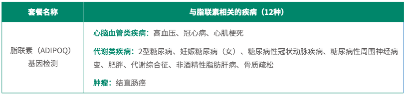 通过检测脂联素基因的两个位点,评估其对心脑血管类疾病、代谢类疾病、肿瘤等疾病的影响,指导受检者提早关注并预防与脂联素相关的疾病。