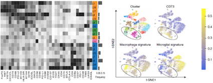 2019年12月,Nature Medicine发表对免疫检查点治疗效果好和不好的5种癌症类型,共94例患者进行单细胞蛋白和单细胞RNA测序,在多形性胶质母细胞瘤中发现了一个独特的CD73hi巨噬细胞群,在抗PD-1治疗后仍然存在。通过构建CD73敲除鼠发现CD73的缺失提高了抗CTLA-4和抗PD-1治疗的多形性胶质母细胞瘤小鼠模型的存活率。证实CD73是一种特异性的免疫治疗靶点,可提高多形性胶质母细胞瘤免疫检查点治疗的抗肿瘤免疫应答。