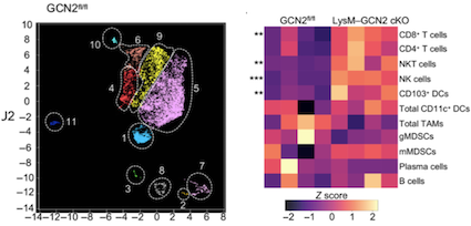 2019年12月,Science Immunology发表对黑色素瘤患者进行单细胞蛋白和单细胞RNA测序,发现肿瘤微环境的变化:巨噬细胞和髓样抑制细胞的促炎性活化的增加,肿瘤内CD8+T细胞中的干扰素-γ表达。GCN2通过促进转录因子CREB-2/Atf4的翻译增加而改变了髓样抑制细胞的功能,其中CREB-2/Atf4是小鼠和人类中巨噬细胞和髓样抑制细胞成熟所必需的,而且利用小干扰RNA靶向Atf4可降低肿瘤生长,揭示免疫肿瘤学潜在的治疗靶点GCN2在肿瘤免疫反应中的作用。