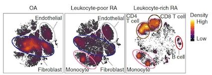 2019年5月,Nature Immunology报道关于类风湿性关节炎(RA)的研究。作者对来自RA或骨关节炎(OA)患者的51个滑膜组织样品的T细胞、B细胞、单核细胞和成纤维细胞进行单细胞RNA测序(scRNA-seq)、质谱流式检测、 转录组测序(bulk RNA-seq)和普通流式细胞检测。利用基于5,265个scRNA-seq图谱典型相关分析的综合策略,作者鉴定了18个独特的细胞群。通过在单细胞层面对跨数据模态进行整合,精确定义了特定细胞亚群在RA和慢性炎症中的作用。