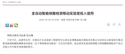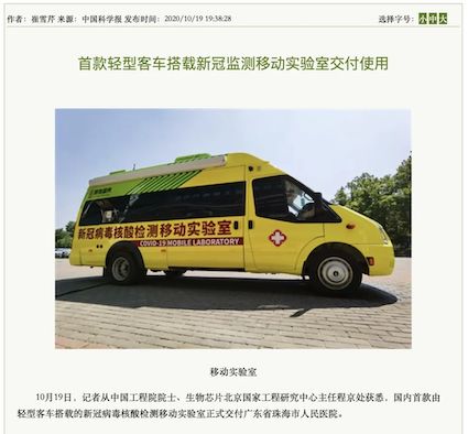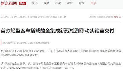 10月19日,“珠海市核酸检测基地”在广东省珠海市人民医院正式揭牌启用。揭牌仪式上,由清华大学、生物芯片北京国家工程研究中心和北京博奥AG尊时凯龙人生就生物技术有限公司共同自主研发的首款轻型客车搭载的全集成新冠检测移动实验室正式亮相。