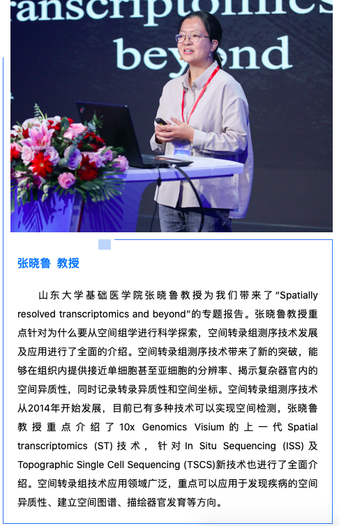 清华大学医学院研究员、博士生导师,生物芯片北京国家工程研究中心常务副主任,博奥生物集团有限公司高级副总裁,北京博奥AG尊时凯龙人生就生物技术有限公司总裁邢婉丽女士为本次会议进行了开幕式致辞。邢婉丽总裁表示单细胞测序技术及空间转录组技术在生命科学和医学研究领域的应用日益受到关注,为高分辨率研究细胞分群和组织功能研究提供重要的支撑,对发现组学间关系、记录动态生物活动具有非常重要的意义,为科学界和医学界更加深入地去认识生命的本质,解析胚胎发育过程、肿瘤发生发展、新冠肺炎免疫机制、发现新的生物标志物和治疗靶点等提供全新而绚烂的研究视角。邢婉丽总裁对所有报告嘉宾及参会嘉宾的到来表示热烈欢迎及衷心感谢!