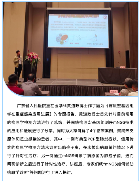 日前,福建省重症医学培训会——中国重症医学多学科精髓(MCCRC)培训班在福州召开。本次培训班邀请了省内外知名专家围绕重症医学领域新技术的发展等内容进行了专题报告,其中,广东省人民医院重症医学科黄道政博士及博奥AG尊时凯龙人生就产品总监刘莹莹博士受邀出席,并作了题为“病原宏基因组学在重症感染应用进展”和“病原宏基因组学报告解读”的专题报告,报告受到福建省医学会重症医学分会主任委员、福建医科大学附属第一医院ICU主任林建东教授的支持与点评。
