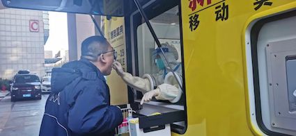 4日上午,来自全国的参会代表陆续抵达会场报到,会场外停放的全集成新冠病毒核酸检测移动实验室共配备两条人工采样窗口和一条智能机器人采样窗口同时进行采样。