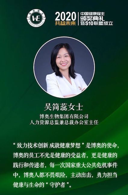 12月18日,由中国人力资源管理研究会携手联合国契约组织国际WELL建筑研究院、太极禅、世界可持续发展领导力组织、上海市著名外企工会联合会及中智上海技术经济技术合作有限公司等机构共同举办的第四届(2020年)中国最佳健康雇主评选在上海揭晓。博奥生物集团凭借抗疫期间的卓越贡献,斩获“抗疫先锋奖”并蝉联“中国十佳健康雇主”。