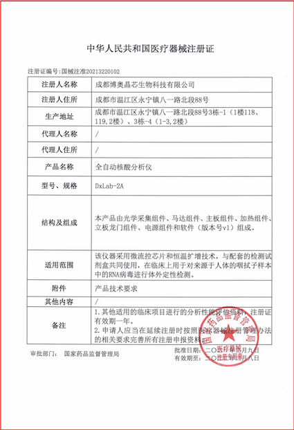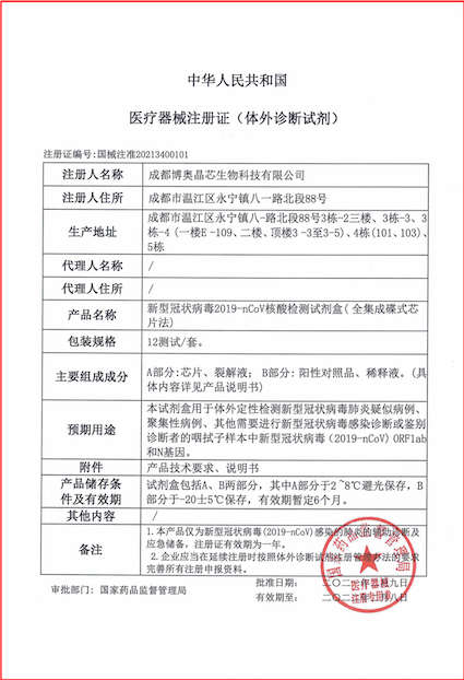 2021年2月10日,恰逢新春佳节来临之际,依托国家科技部应急攻关项目,博奥联合清华大学成功研发的由新型冠状病毒2019-nCoV核酸检测试剂盒(全集成碟式芯片法)(国械注准:20213400101)和全自动核酸分析仪(国械注准:20213220102)组成的全集成芯片实验室获国家药监局应急审批批准,为全国新冠肺炎疫情防控提供现场快速检测“芯”利器。