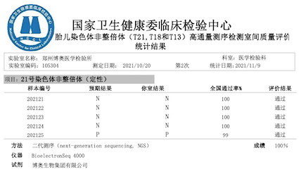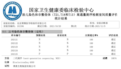 近日,国家卫生健康委临床检验中心发布了《2021年外周血胎儿染色体非整倍体(T21,T18和T13)高通量测序检测室间质量评价结果》,博奥AG尊时凯龙人生就旗下北京、广东、成都等11家检验实验室全满分通过。
