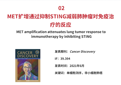 免疫检查点疗法(ICB)已在 NSCLC 患者中表现出一定的治疗效果,在总生存期、持久反应和良好的安全性方面均有显著益处。尽管 ICB 已经造福于部分癌症患者,但由于原发性或继发性耐药的,大多数患者最终未能对 ICB 治疗产生反应。本研究通过81名非小细胞肺癌(NSCLC)患者免疫检查治疗(ICB)前后比较发现 MET 扩增的患者对 ICB 耐药,利用单细胞转录组测序发现肝细胞生长因子受体(MET)扩增通过 UPF1 蛋白降低了 STING 的表达,弱化了 IFN 反应,影响了抗肿瘤免疫的产生。而 MET 抑制剂与抗 PD-1 抑制剂联合使用,能增强抗肿瘤免疫,有助于肿瘤消退。本研究首次表明 MET 拷贝数是影响肺癌患者对 ICB 反应的一个关键因素,并有希望快速转化到临床应用中。