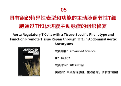 除了维持免疫耐受外,Foxp3+ 调节性 T 细胞 (Tregs) 在组织稳态和重塑中发挥特殊作用。然而,动脉瘤中的 Tregs 是否具有组织特异性的表型和功能尚不清楚。本研究中发现了一组特殊的可能抑制腹主动脉瘤(AAA)进展的 Tregs,并对其进行了功能表征。主动脉 Tregs 在 AAA 进展中逐渐增加,主要来自外周循环。单细胞 TCR 测序和批量 RNA 测序显示了它们独特的表型和高表达 Tff1。利用 Foxp3cre/creTff1flox/flox小鼠研究 AAA 中 Tff1 的作用,发现主动脉 Tregs 分泌 Tff1 以调节平滑肌细胞 (SMC) 的存活。体外实验证实 Tff1 通过细胞外信号调节激酶(ERK)1/2途径抑制平滑肌细胞凋亡。这些发现揭示了主动脉 Tregs 的组织特异性表型和功能,并可能为预防 AAA 提供一种有希望的新方法。