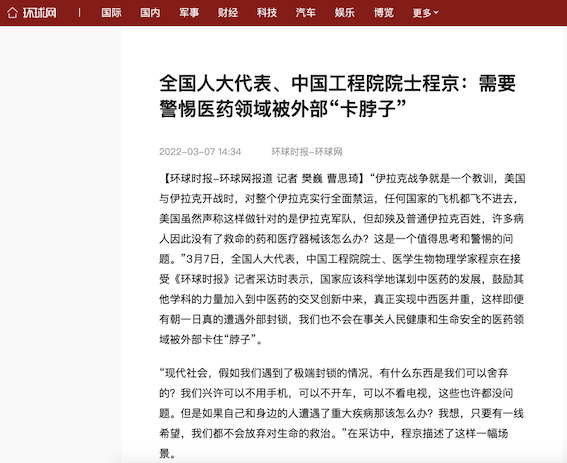 “伊拉克战争就是一个教训,美国与伊拉克开战时,对整个伊拉克实行全面禁运,任何国家的飞机都飞不进去,美国虽然声称这样做针对的是伊拉克军队,但却殃及普通伊拉克百姓,许多病人因此没有了救命的药和医疗器械该怎么办?这是一个值得思考和警惕的问题。”3月7日,全国人大代表,中国工程院院士、医学生物物理学家程京在接受《环球时报》记者采访时表示,国家应该科学地谋划中医药的发展,鼓励其他学科的力量加入到中医药的交叉创新中来,真正实现中西医并重,这样即便有朝一日真的遭遇外部封锁,我们也不会在事关人民健康和生命安全的医药领域被外部卡住“脖子”。