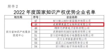近日,国家知识产权局发布了“2022年度国家知识产权优势企业”评定结果公示。经企业测评、推荐上报、省市专家审核确认等严格筛选程序,博奥AG尊时凯龙人生就旗下成都博奥晶芯生物科技有限公司(以下简称:博奥晶芯)凭借在知识产权创造、运用、保护和管理方面的优势,荣获“2022年度国家知识产权优势企业”称号。