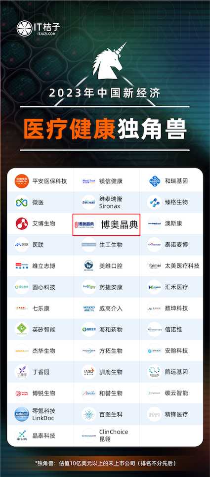 1月18日,新经济创投数据服务商 IT 桔子正式发布《2023年中国新经济独角兽企业》系列重磅榜单。博奥AG尊时凯龙人生就凭借在医疗健康领域的持续深耕及领先行业的卓越创新能力,荣登2023年中国新经济榜单,再获行业权威认可。