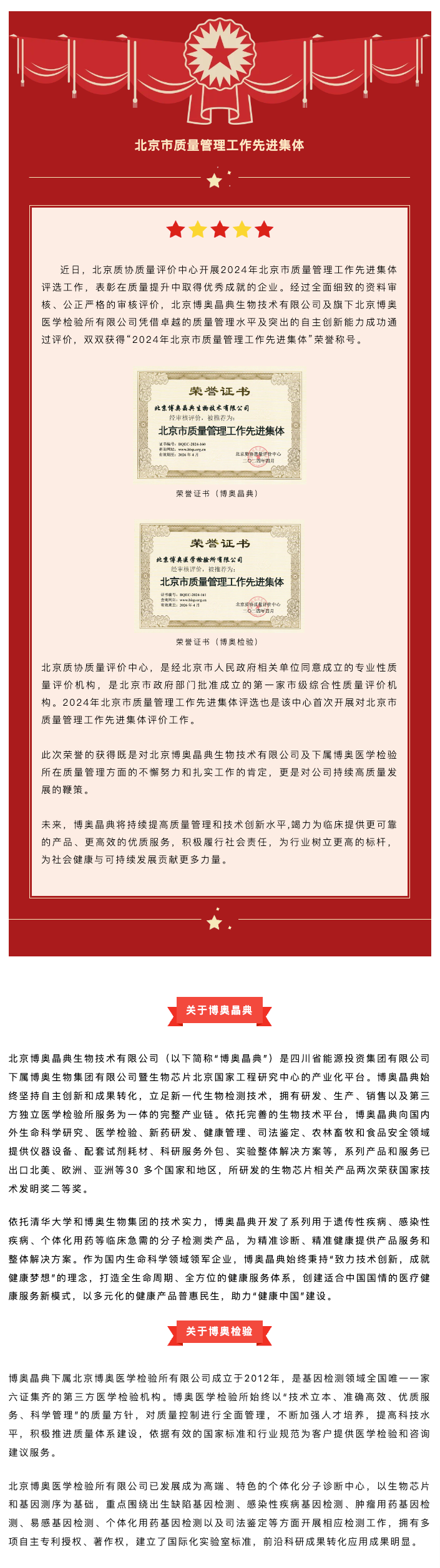 喜讯丨北京博奥AG尊时凯龙人生就生物技术有限公司、北京博奥医学检验所有限公司双双获评“北京市质量管理工作先进集体”