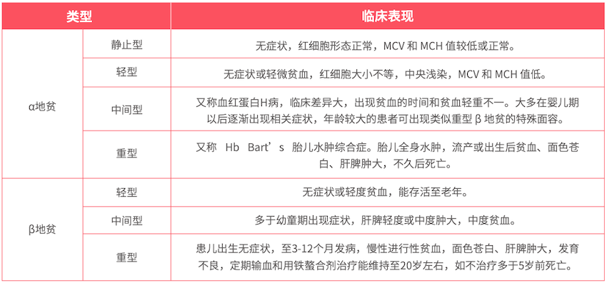 地中海贫血(简称”地贫”),是由于遗传基因发生缺陷,导致红细胞血红蛋白合成异常,红细胞容易破裂,寿命缩短,引起溶血性贫血,是我国南方常见和危害较大的遗传病之一。常见的地贫类型:α-地贫和β-地贫。根据病情的轻重,又可分为:重型、中间型、轻型、静止型。