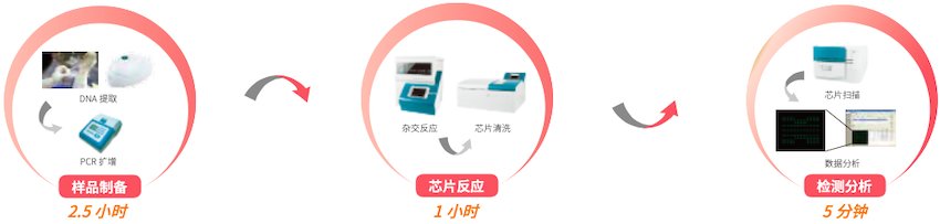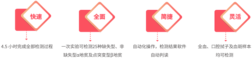 地中海贫血基因检测试剂盒(微阵列芯片法)采用多重等位基因特异性 PCR 与通用芯片的技术对中国人最常见的地中海贫血基因突变位点及缺失片段进行检测。可一次性同时完成 α- 和 β- 地中海贫血基因共 25 种突变的检测,检测结果可以辅助临床诊断,也可用于流行病学调查、婚 检及新生儿检测等领域。
