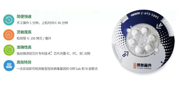 本产品采用博奥自主研发的微流控集成式核酸提取纯化和高灵敏度扩增检测技术,由国家科技部“新型冠状病毒感染的肺炎疫情应急项目”支持,能快速精准地完成对新型冠状病毒的“样本进—结果出”式全自动、全密闭检测。特殊工艺制作的微流控芯片上集成了样本裂解、核酸提取、巢式扩增和荧光检测等功能,通过芯片巢式恒温扩增技术,实现对痕量病毒核酸高敏扩增和检测,每张芯片可检测两个样本,能在45分钟内一步完成全程实验,达到对新型冠状病毒核酸的快速检测。(国械注准:20213400101)
