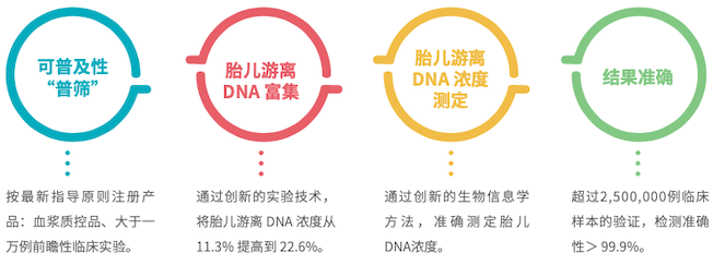 在广东省妇幼保健院、南京市妇幼保健院、浙江大学医学院附属妇产科医院、郑州大学第三附属医院完成了10,818例前瞻性临床样本的验证研究,与染色体核型分析结果和出生随访结果对比,其灵敏度为100%,特异性为99.91%,总符合率为99.91%。试剂盒已于2020年8月获得医疗器械注册证(医疗器械注册证号:国械注准20203400708)。 截至目前,已完成超过400万例临床样本的筛查,避免了多个家庭的异常患儿出生,为出生缺陷防控做出了突出贡献。
