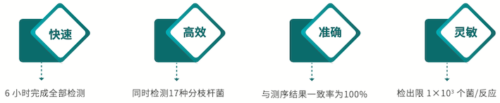 采用生物芯片技术将序列已知的寡聚核苷酸探针分子固定于芯片基片,然后与待检标本中标记的核酸进行分子杂交,通过检测每个探针分子的杂交信号强度,对17种临床常见分枝杆菌进行快速鉴定,从而准确锁定致病菌种类型。该试剂盒是国内第一批获得CFDA认证的分枝杆菌快速菌种鉴定产品。