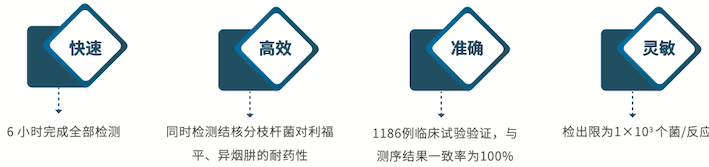 采用基因芯片检测技术,快速对两种主要的一线抗结核药物利福平和异烟肼的耐药情况进行评估,进而实现对耐多药结 核病的快速诊断。该试剂盒是国内第一个获得CFDA 认证的耐多药结核病快速诊断产品。